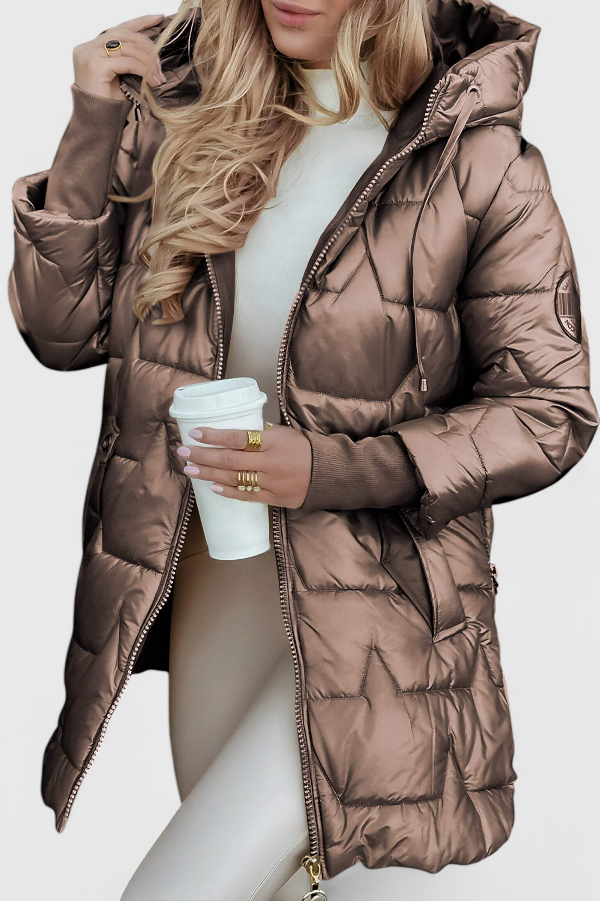 Lesklá Zateplená Bunda s Kapucí a Geometrickým Designem