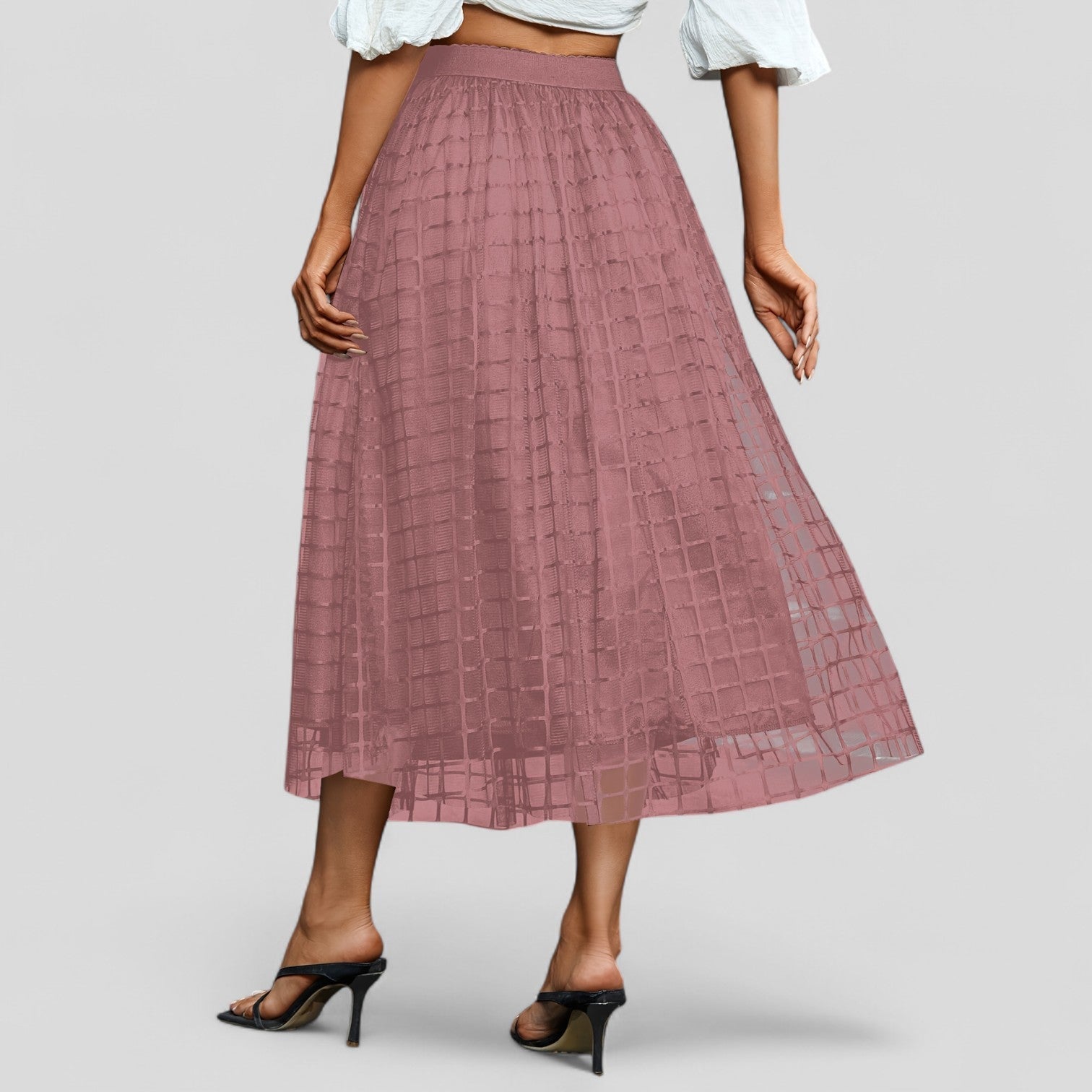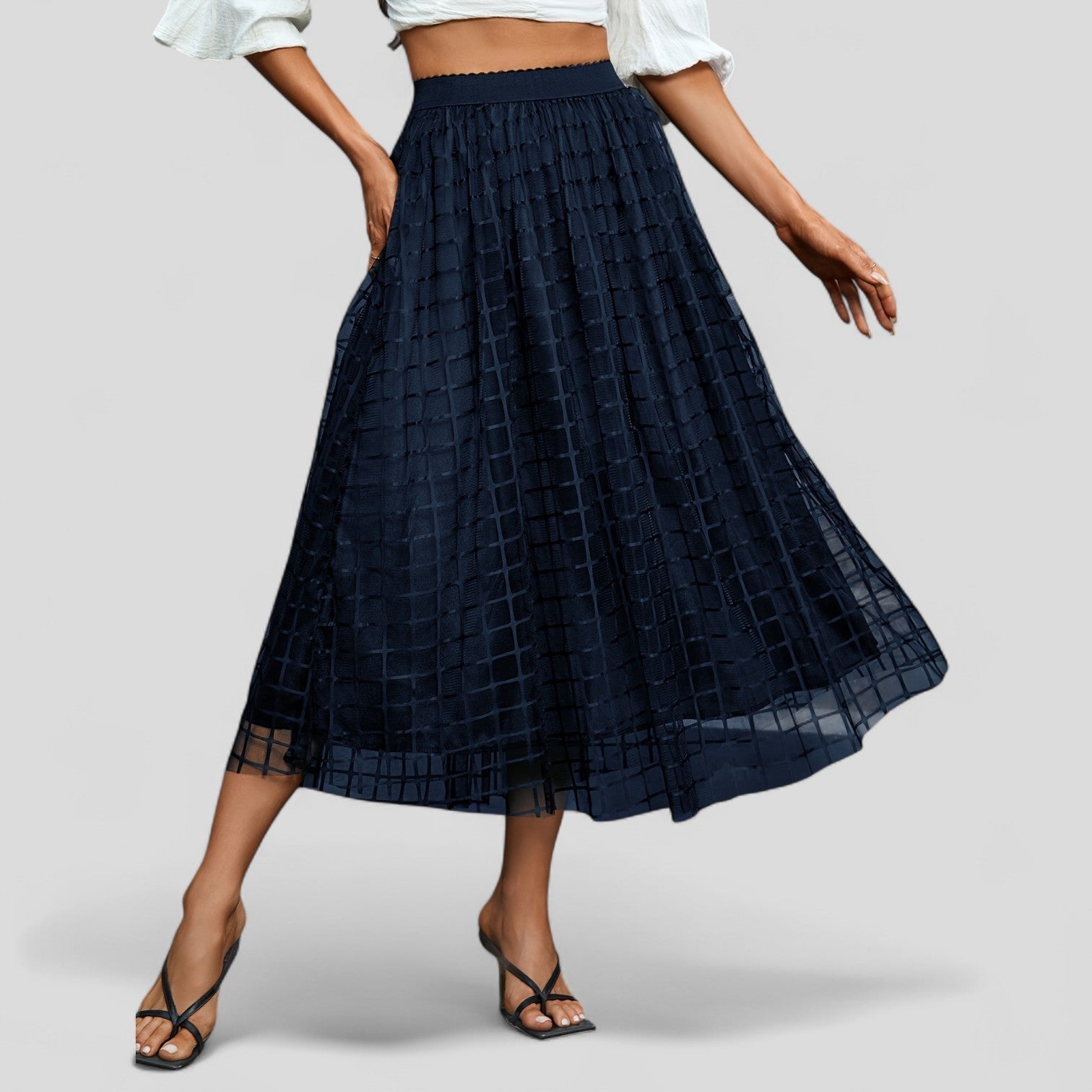 Přijatelná atraktivní midi sukně z průhledného síťového materiálu v moderním mřížkovém designu. Elegantní A silueta zajišťuje ženský siluetu s velkým pohybem, zatímco neprůhledná podšívka nabízí příjemné pohodlí při nošení.