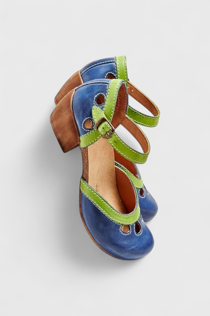 Vyjádřete svou individualitu s naším ručně vyráběným designem obuvi, skutečným uměleckým dílem pro vaše nohy. Vytvořeny pro ženu s volným duchem, tento model spojuje retro inspirovaný siluet s živým kontrastem a originálními perforacemi. Jejich odolný blokový podpatek nejenže dodává výrazný akcent, ale také zajišťuje vynikající komfort a stabilitu. Jsou to ideální boty, které do každodenního oblečení vnášejí barvu, kreativitu a radost.